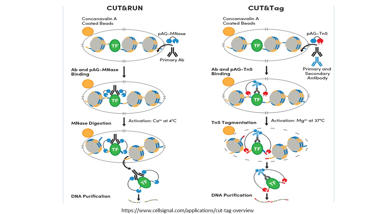 Ce protocole a été adapté pour les études sur cellules uniques et noyaux avec le CUT & Tag (Kaya-Okur, H.S. et al. 2020) qui utilise la pA-Tn5 qu’on peut indexer avec des adaptateurs. Son activation en présence de Mg++ entraine la tagmentation avec intégration des adaptateur dans l’ADN cible et ainsi évite l’étape de ligation dans la préparation de la banque pour le séquençage (voir figure)