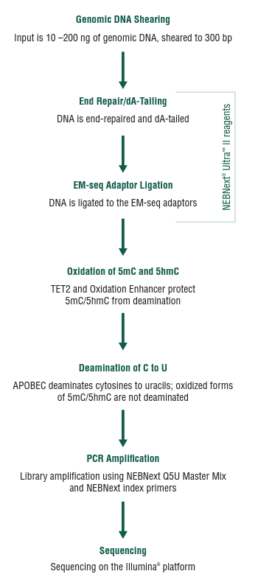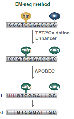 Bisulfite sequencing detects 5-methylcytosine (5mC) and 5-hydroxymethylcytosine (5hmC) at single-base resolution. However, bisulfite treatment damages DNA, which results in fragmentation, DNA loss, and biased sequencing data. To overcome these problems, enzymatic methyl-seq (EM-seq) was developed by NEB, see fig.1 (NEBNext® Enzymatic Methyl-seq Kit, NEB).